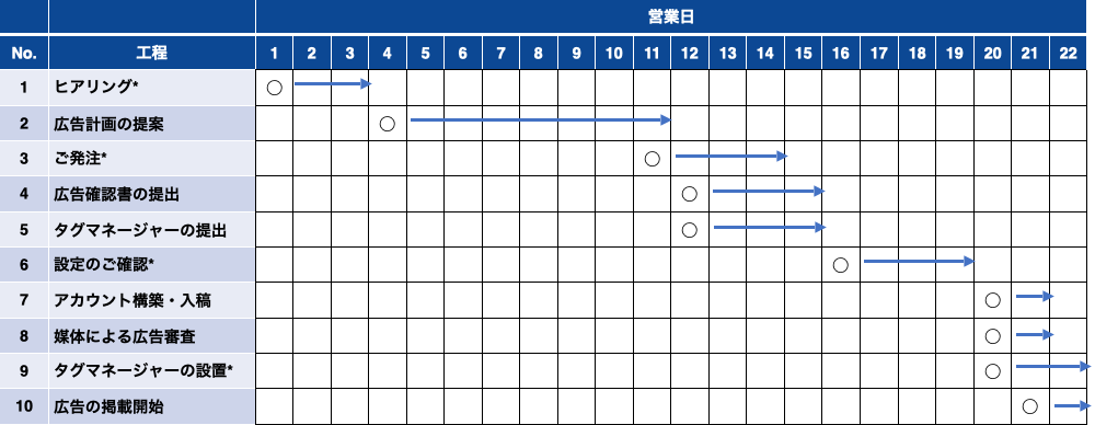 以下のスケジュールは、各工程における確認日数や媒体の審査日数によって変動します。